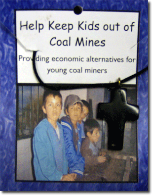 Available in heart and cross designs, these necklaces pay youth a living wage to make jewelry from coal as an alternative to working in coal mines.