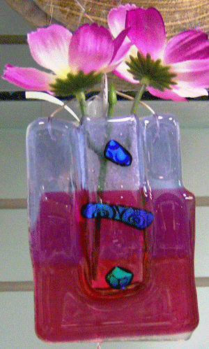 Fused and dichroic glass makes these vases a brilliant additional to an office cubicle or personal space. Vases hold water for fresh flowers. Assorted colors.